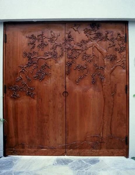 Pictured below are entry gates made from solid cherry wood with a blossoming cherry tree and two doves carved into the outside.