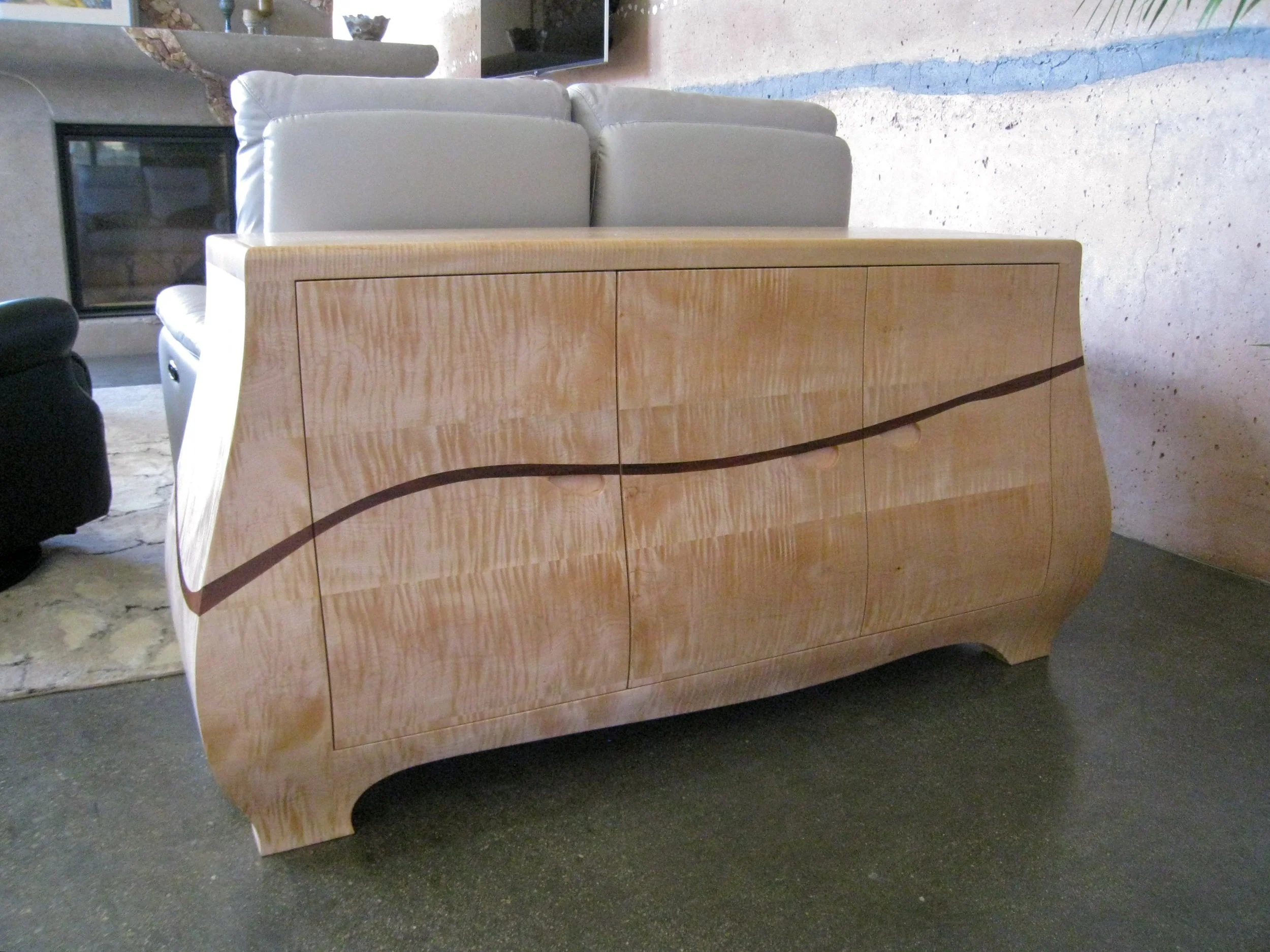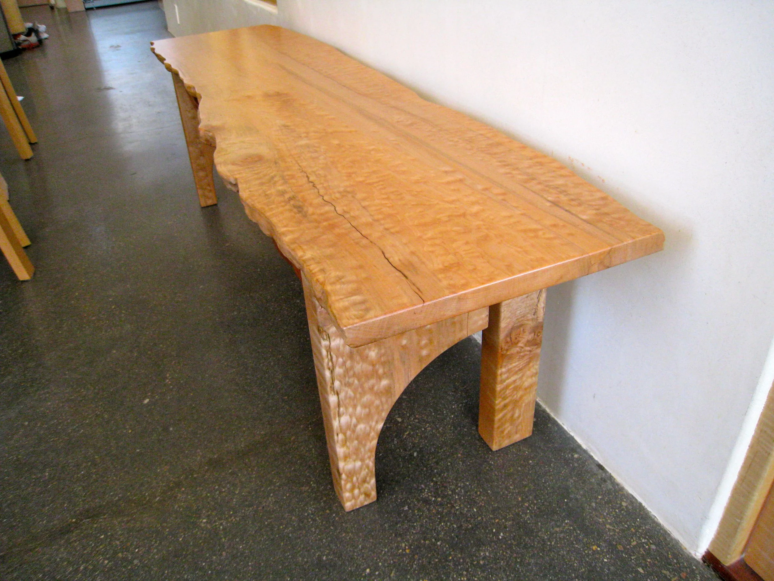 I also designed and built a bench for the living room out of quilted maple with natural live edges and a jatoba pull-out shelf with outlets to recharge all the families mobile devices.