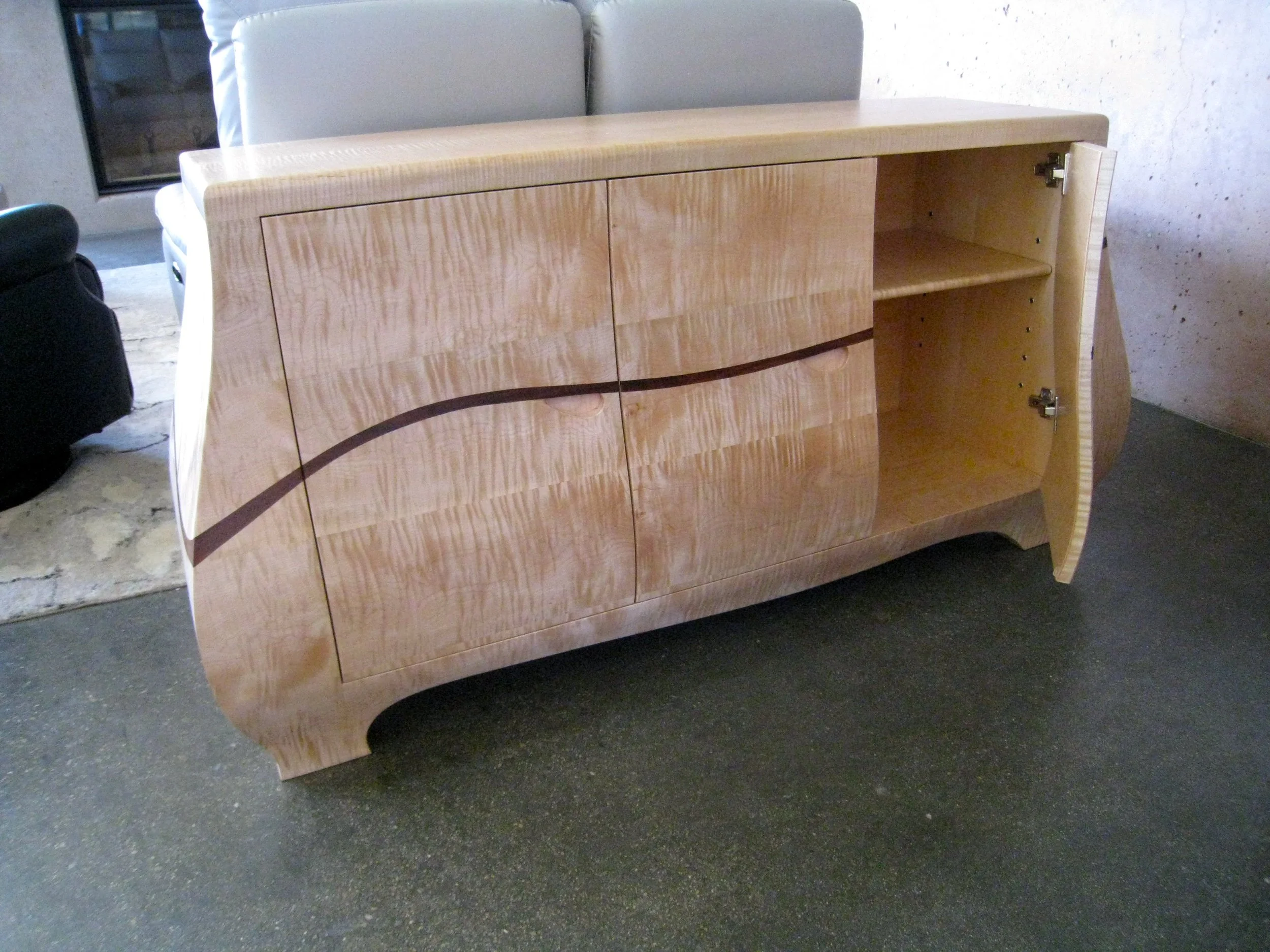 One of the pieces the family wanted was a sheet music stand to sit next to my client's mother's rosewood piano. The cabinet is made up of compound curves, built out of highly-figured curly maple with rosewood inlay. It's simplistic beauty doesn't reflect the amount of work that went into building it and I am extremely pleased with how it turned out.