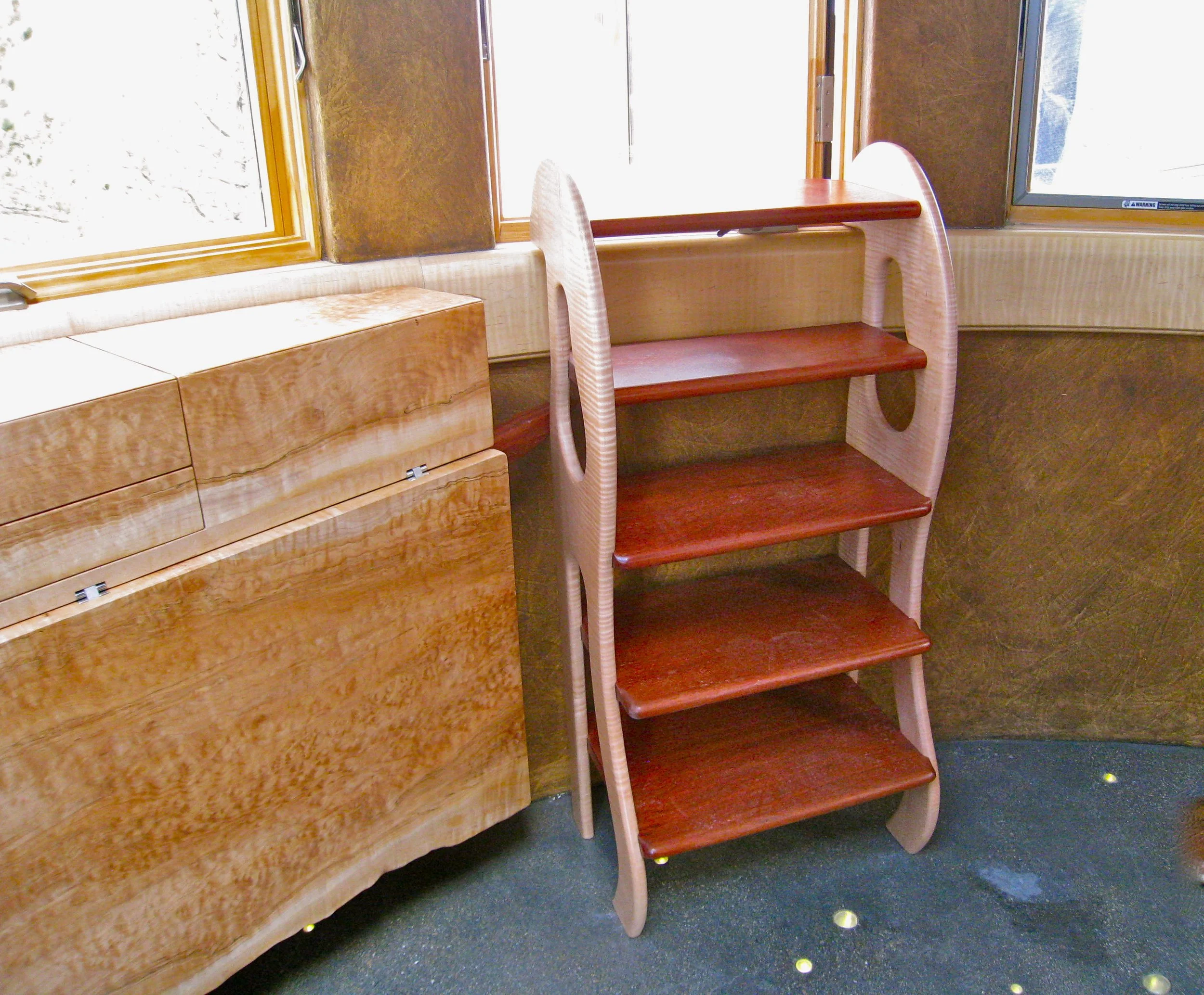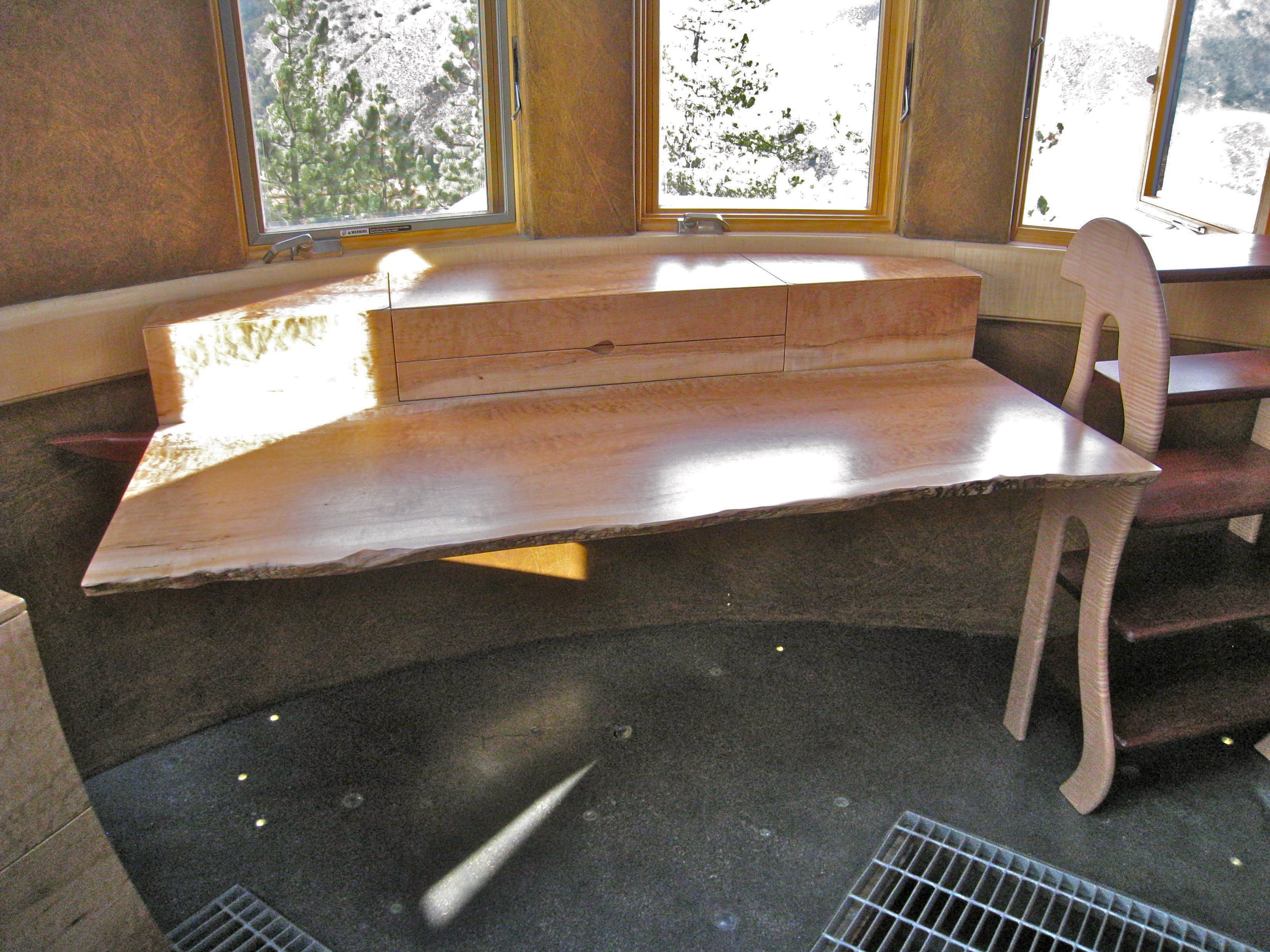 In the tower observatory was my client's office, so I built a desk and filing cabinet. The desk, which has a fold-down top with a live edge, is made of one large slab of quilted maple, and has drawers and lift-up storage. The tower office is a small space, so the fold-up and fold-down table top on the desk is quite efficient for the space. I also built a small filing cabinet out of the quilted maple to match the desk.