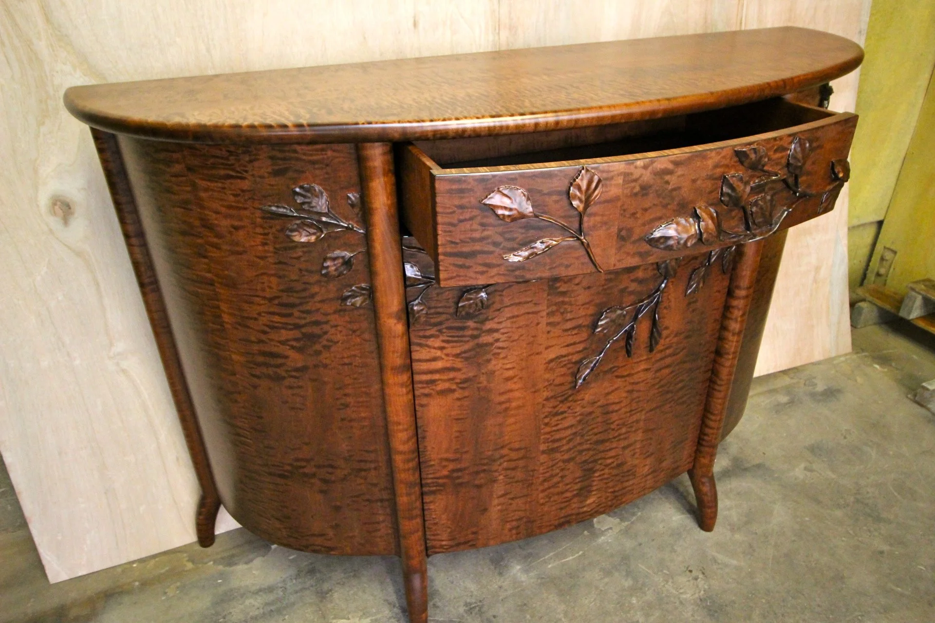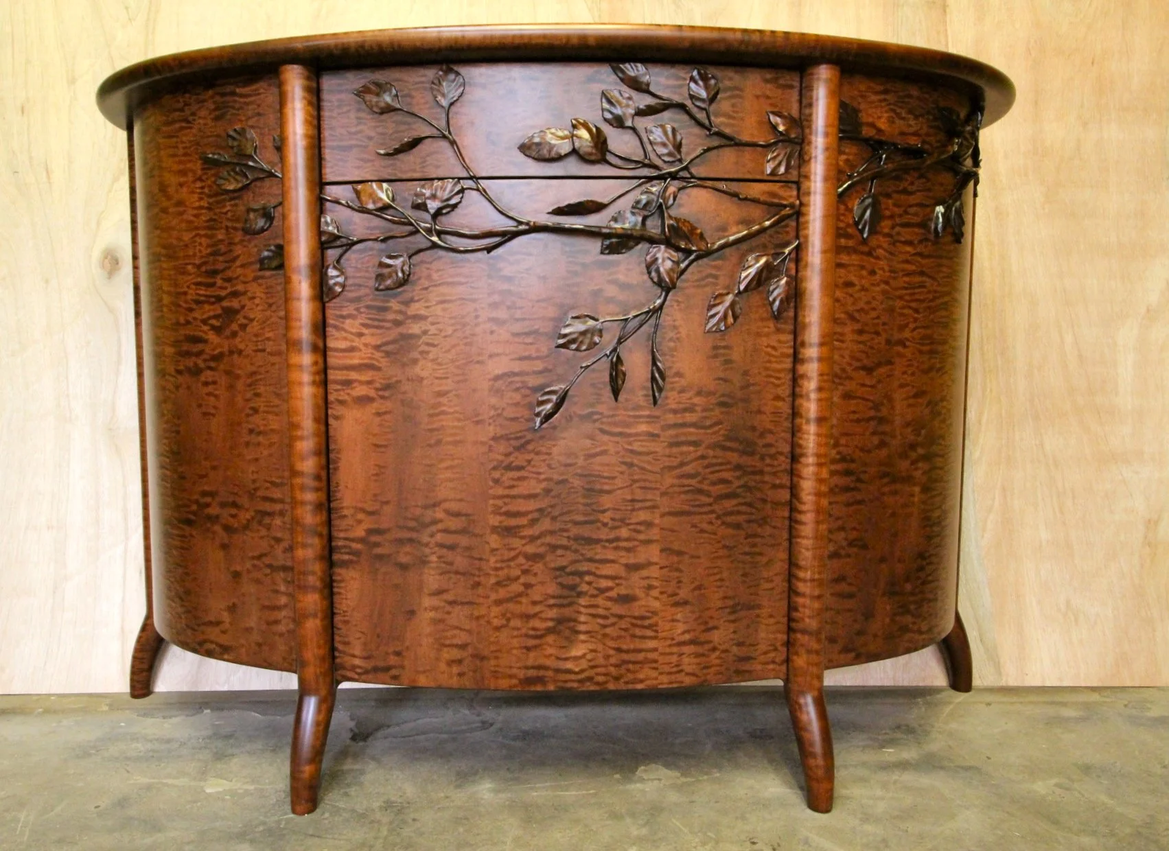 Above: Close up of cabinet with hand-carved mountain maple branches