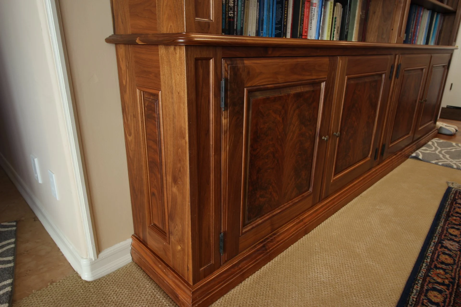 The large family room has a built-in bar, book shelves and an entertainment center which is a large screen TV cabinet. Everything is made of solid walnut with crotch grain walnut panels and drawer fronts in classic style detailing.