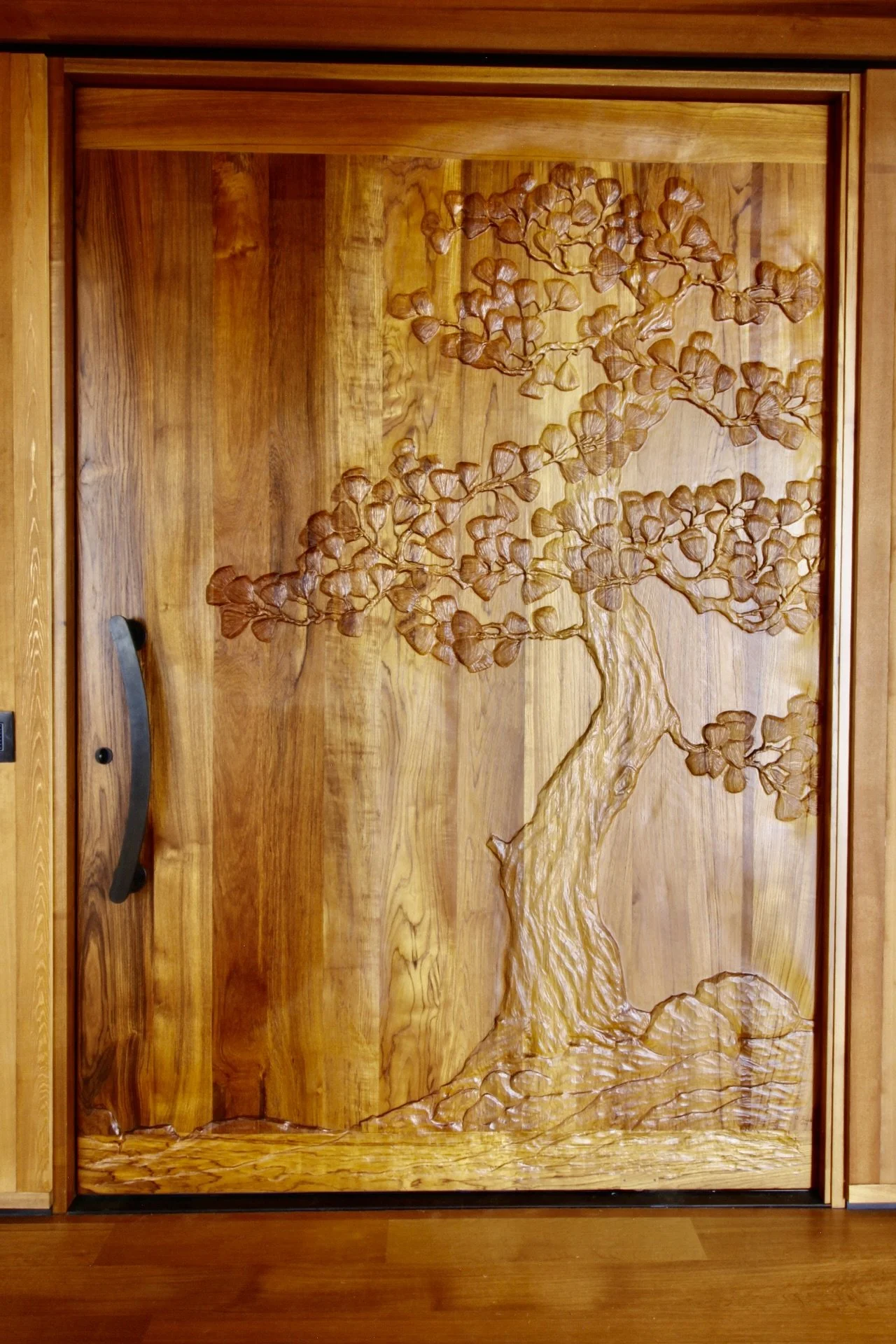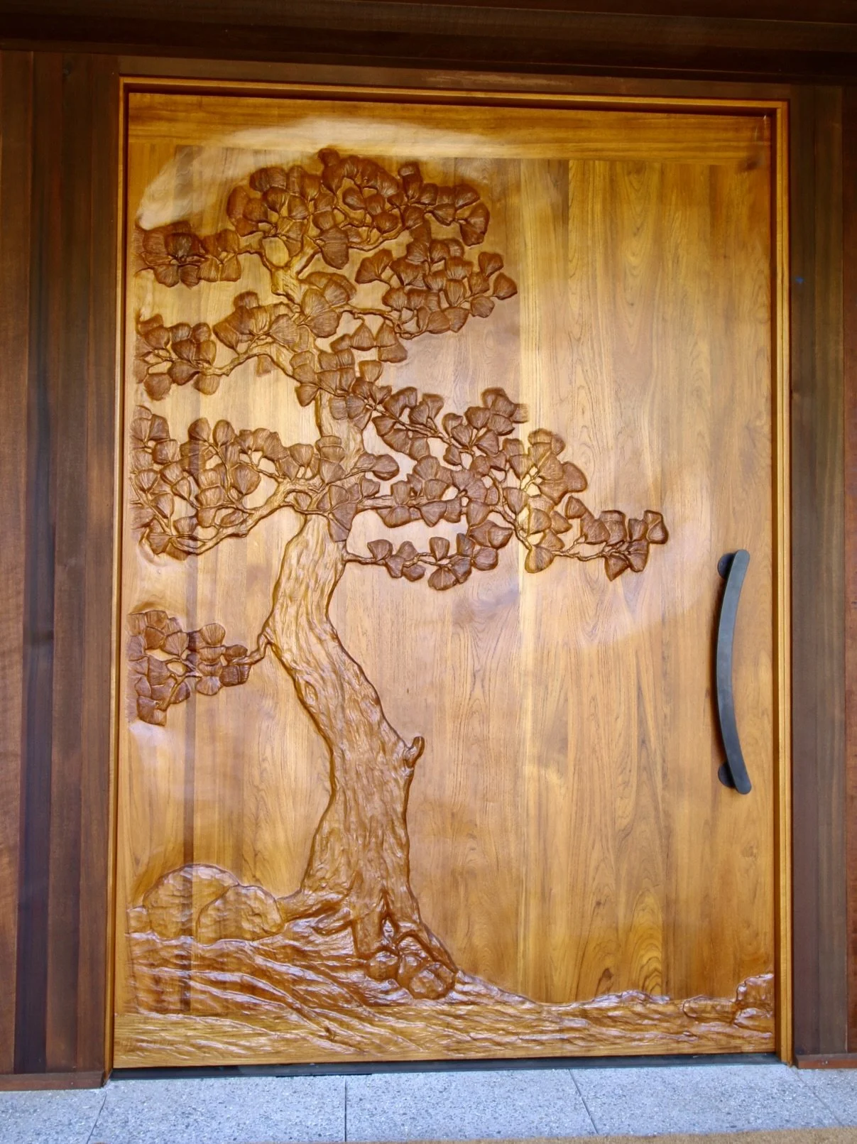 The door is solid teak, 2-1/4 inches thick by 6 feet wide by 9 feet tall. It is hand carved on both sides with a Japanese-style pine tree. I worked closely with the ownbers on the design and type of pine tree as they had a specific look they wanted. I really enjoy working with clients, helping them achieve the look they are envisioning.